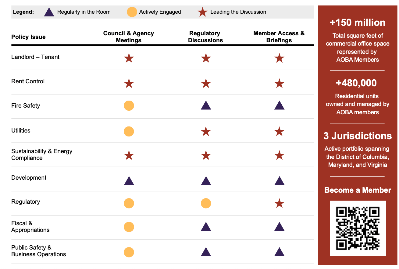 As the voice of the commercial and residential real estate industry in the Washington D.C. area, AOBA is ideally positioned to help our members meet the challenges and capture the opportunities facing our ever-changing industry. With our finger on the pulse, we can anticipate, influence, and respond to a wide variety of critical issues and initiatives. Our membership is comprised of a diverse group of residential commercial office, institutional and public buildings, as well as highly valued affiliate companies providing key building-related services. Their collective experience and expertise, combined with the capabilities of our professional staff, are devoted solely to the promotion of the residential and commercial real estate industry. Our long-standing relationships with local and state policymakers have enabled us to effectively mobilize around legislative and regulatory issues to advocate for a competitive, business-friendly environment throughout the region. In addition to advocacy, AOBA is committed to professional development and networking, including a strong focus on fostering the next generation of commercial real estate professionals. Our programs and offerings provide AOBA members with unique and rewarding opportunities to grow personally and professionally. We encourage you to take a closer look at the array of benefits and opportunities our organization has to offer. To provide even greater transparency into our advocacy work, check out our matrix below outlining the policy issues we are actively engaged in monitoring, giving you a clear view of where AOBA is at the table.